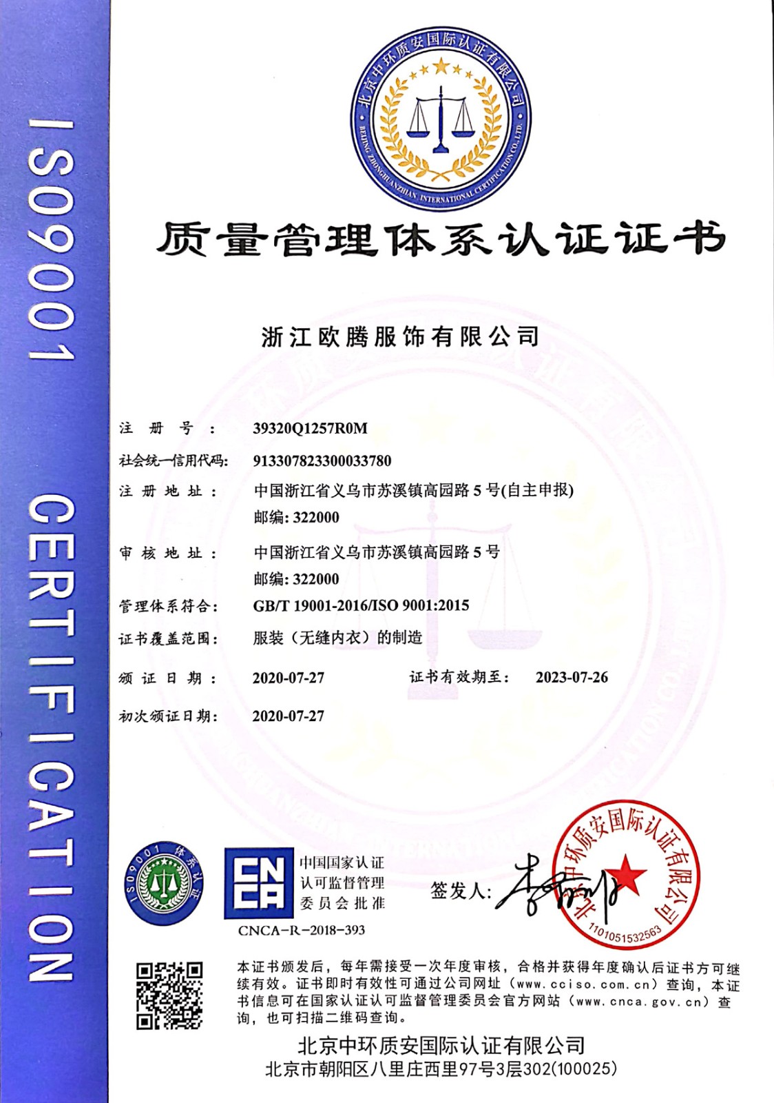 浙江歐騰服飾有限公司位于世界小商品之都-義烏。創(chuàng)立于2015年,是一家專業(yè)生產無縫針織運動服飾和內衣的工貿一體企業(yè),擁有自主出口權。 工廠的占地面積約16000平方米 ,引進了大型圣東尼、高騰等多種先進的制衣設備300余臺。月產能可達90萬件。 歐騰服飾每年投入近百萬資金打樣開發(fā)新產品,有著一支高素質設計、技術員工隊伍。工廠先后通過了ISO 9001質量管理體系認證、BSCI認證、GRS認證、OEKO-TEX國際生態(tài)紡織品認證等多項專利檢測報告。可提供OEM&ODM服務。歐騰服飾以一套完整、科學的質量管理體系,生產的服裝從原材料紗線到成衣,質量完全能夠滿足國內、國際質量要求。獲得了客戶一致好評。工廠先后獲得省科技型企業(yè)、國家高新企業(yè)、義烏市誠信講信用單位、規(guī)上企業(yè)、信用AAA級等榮譽。